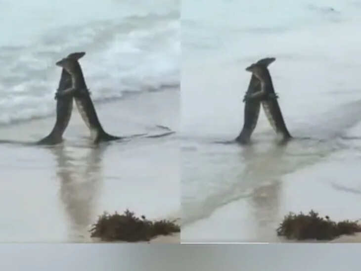 बीच पर एक-दूसरे को गले लगाते दिखे 2 बड़ी छिपकलियां, कैप्शन दिया- 'तेरे मेरे बिच में कैसा है ये बंधन'