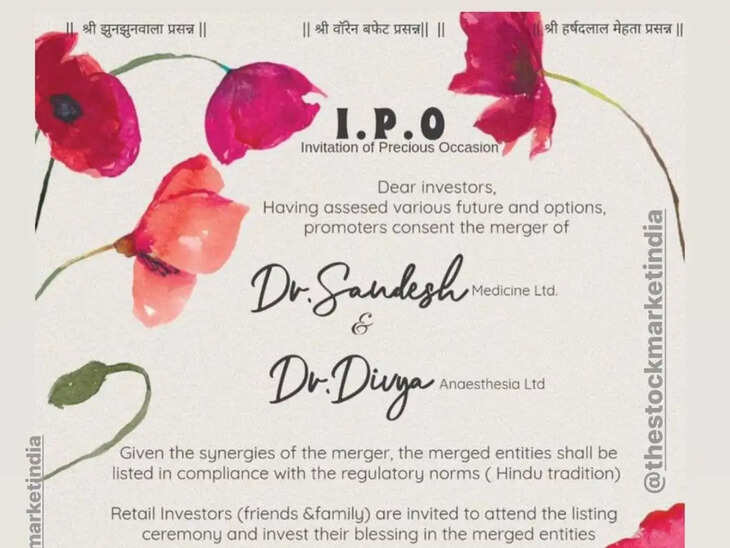 दूसरी ओर, आपको कहना होगा कि आपको कहना होगा कि आपको कहना होगा। शादी के कार्ड में सबसे ऊपर भगवान का नाम लिखा होता है। आमतौर पर भगवान गणेश का नाम लिखा जाता था लेकिन भगवान के नाम की जगह राकेश झुनझनवाला, वारेन बफेट और हर्षद मेहता का नाम लिखा गया है। इसके बाद कार्ड पर अंग्रेजी में आईपीओ लिखा होता है, जिसे शेयर बाजार की भाषा में इनिशियल पब्लिक ऑफरिंग कहते हैं, लेकिन इस कार्ड में इनविटेशन ऑफ प्रेशियस ऑकेजन लिखा होता है। इतना ही नहीं, वर-वधु को एक इकाई, परिवार को एक निवेशक और विवाह स्थल को स्टॉक एक्सचेंज के रूप में लिखा जाता है।