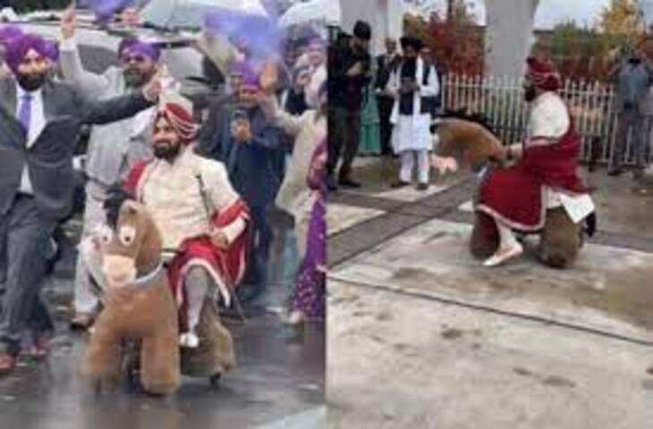 इंस्टाग्राम अकाउंट @imjustbesti अक्सर विचित्र वीडियो पोस्ट करता है। हाल ही में इस अकाउंट पर एक वीडियो शेयर किया गया था जिसमें एक दूल्हा खिलौने के घोड़े (Groom on Toy horse Video) पर बैठकर बारात लेकर जा रहा है. वह एक सिख व्यक्ति है और उसके साथी भी सिख हैं, इससे पता चलता है कि बारात सिखों की है. मजेदार बात यह है कि दूल्हा एक खिलौने वाले घोड़े पर चलता नजर आ रहा है।
