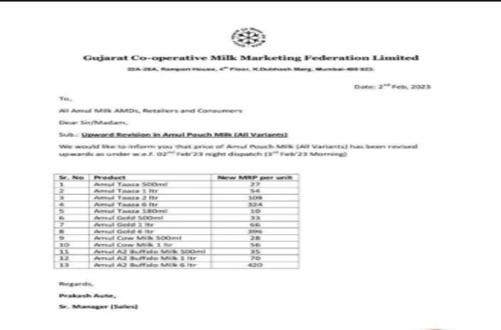गोवा न्यूज डेस्क !! गुजरात कोऑपरेटिव मिल्क मार्केटिंग फेडरेशन लिमिटेड (जीसीएमएमएफ) ने तत्काल प्रभाव से अमूल पाउच दूध (सभी वेरिएंट) की कीमतों में 3 रुपये प्रति लीटर की बढ़ोतरी की है। दिल्ली, कोलकाता और महाराष्ट्र के उपभोक्ताओं के लिए दाम बढ़ाए गए हैं। जीएमसीसीएफ ने एक बयान में कहा, हम आपको सूचित करना चाहते हैं कि अमूल पाउच दूध (सभी प्रकार) की कीमत 2 फरवरी, 2023 रात से संशोधित की गई है। कीमतों में बढ़ोतरी के बाद अमूल ताजा एक लीटर 54 रुपये का हो जाएगा। अमूल गोल्ड एक लीटर 66 रुपये, अमूल गाय का दूध 56 रुपये में मिलेगा। अमूल दूध के सभी वेरिएंट की कीमतों में बढ़ोतरी की गई है।
