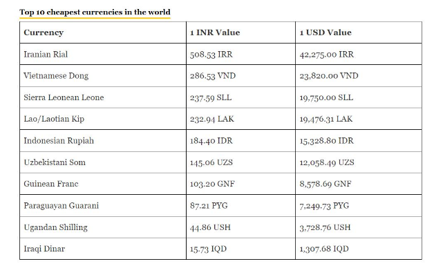 जैसा कि फोर्ब्स ने दुनिया की सबसे मजबूत मुद्राओं की एक सूची जारी की है। खैर, इसी तरह दुनिया की कमजोर मुद्राओं की सूची भी जारी की गई है। इसमें पहला स्थान ईरानी रियाल () को दिया गया है। वहीं, दसवां स्थान इराकी दिनार का है।