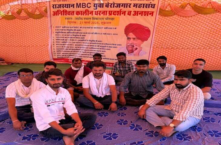 दौसा जिले के सिकंदरा स्थित गुर्जर शहीद स्थल पर एमबीसी (मोर बेकवर्ड क्लास) बेरोजगार अभ्यर्थियों का धरना 11वें दिन भी जारी रहा। अभ्यर्थी अपनी विभिन्न मांगों को लेकर प्रदर्शन कर रहे हैं और सरकार से जल्द समाधान की अपील कर रहे हैं। इसी बीच, मंगलवार को युवा कांग्रेस से जुड़े पदाधिकारी भी धरना स्थल पर पहुंचे और प्रदर्शनकारियों को अपना समर्थन दिया।