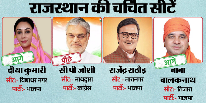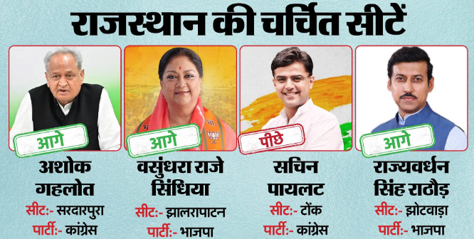 राजस्थान में विधानसभा की 199 सीटों पर 25 नवंबर को मतदान हुआ था। श्रीगंगानगर जिले की श्रीकरणपुर सीट पर कांग्रेस उम्मीदवार गुरमीत सिंह कुन्नर के निधन के कारण चुनाव स्थगित कर दिया गया था। इस चुनाव में मतदाताओं ने चुनाव में उतरे 1863 उम्मीदवारों की किस्मत का फैसला किया। आइए जानते हैं अहम हॉट सीटों का हाल...