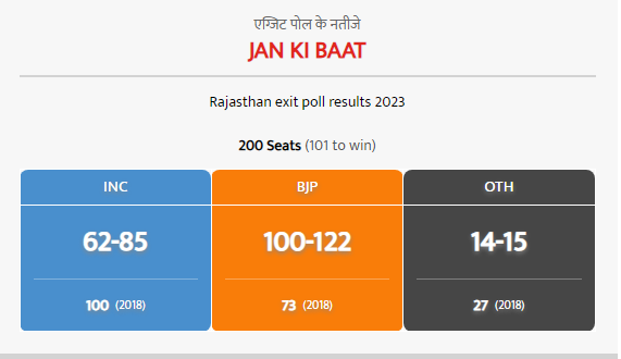 जन की बात एग्जिट पोल के अनुसार, राजस्थान में कांग्रेस को झटका लगा है। वहीं, राज्य में भाजपा को पूर्ण बहुमत की सरकार बनाते दिख रही है।