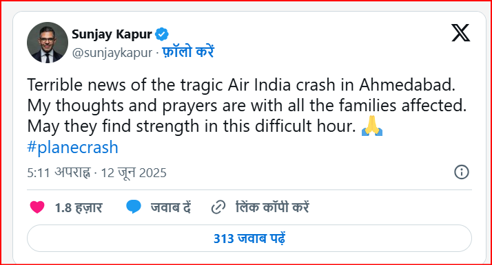 संजय कपूर ने 12 जून को शाम 5:11 बजे अपने एक्स अकाउंट पर एक पोस्ट शेयर की। इस पोस्ट में संजय ने गुजरात के अहमदाबाद विमान हादसे पर दुख जताते हुए लिखा कि अहमदाबाद में एयर इंडिया विमान हादसे की दुखद खबर। मेरी संवेदनाएं और प्रार्थनाएं सभी शोक संतप्त परिवारों के साथ हैं। भगवान उन्हें इस मुश्किल घड़ी में शक्ति दे। #हवाई जहाज हादसा।