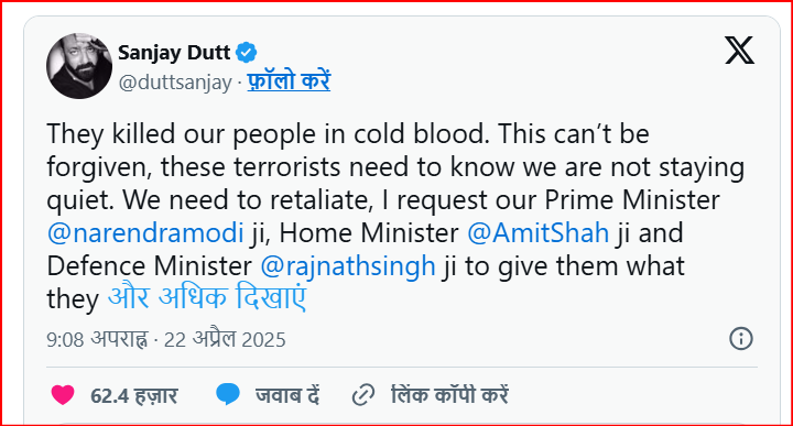 वहीं संजय ने अपना गुस्सा जाहिर करते हुए लिखा- उन्होंने हमारे लोगों को बेरहमी से मार डाला। इसे माफ़ नहीं किया जा सकता. इन आतंकवादियों को यह पता होना चाहिए कि हम चुप नहीं बैठेंगे। हमें इसका ठोस जवाब देना होगा। मैं हमारे प्रधानमंत्री नरेंद्र मोदी जी, गृह मंत्री अमित शाह जी और रक्षा मंत्री राजनाथ सिंह जी से अनुरोध करता हूं कि उन्हें उनके किए की सजा दी जाए।