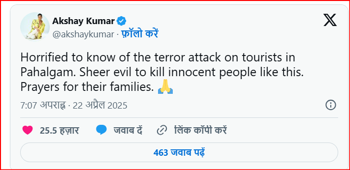 अक्षय ने लिखा कि- पहलगाम में पर्यटकों पर हुए आतंकी हमले की खबर सुनकर दिल टूट गया। इस तरह निर्दोष लोगों की हत्या करना सरासर बर्बरता है। मैं पीड़ित परिवारों के लिए प्रार्थना करता हूँ।