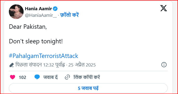 आपको बता दें, हनिया आमिर ने एक बार फिर पाकिस्तान से चुप्पी तोड़ने को कहा है। पहलगाम आतंकी हमले पर पाकिस्तानी अभिनेत्री ने लिखा, 'आज आपकी चुप्पी कल आपके बच्चों को परेशान करेगी। अब कुछ करो, नहीं तो उन्हें कष्ट होगा।' इस हमले के बाद हनिया आमिर बहुत उदास हैं और पूरे दिल से भारत का समर्थन कर रही हैं। इससे पहले उन्होंने एक और पोस्ट शेयर कर कहा था, 'गुस्सा और दुख से भारी हुई हूं।' यह लिखते हुए उन्होंने 'सभी की निगाहें पहलगाम पर' शीर्षक से एक पोस्ट साझा की थी।