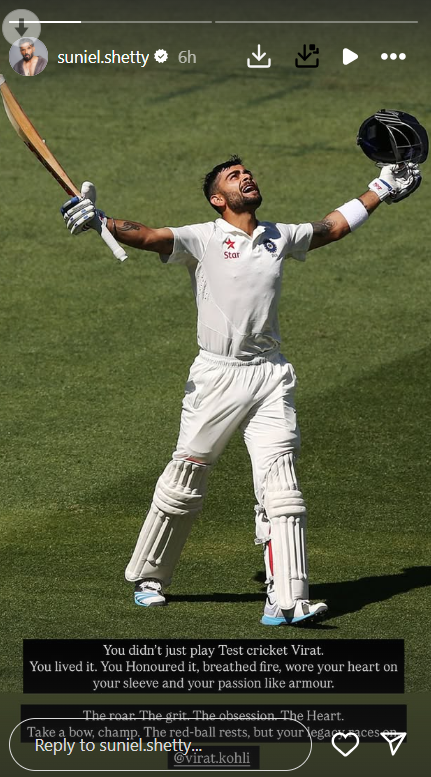 केएल राहुल के ससुर और बॉलीवुड सुपरस्टार सुनील शेट्टी ने पोस्ट शेयर करते हुए लिखा, "आपने सिर्फ विराट टेस्ट क्रिकेट नहीं खेला, आपने इसे जिया। आपने इसका सम्मान किया, हमेशा जुनून में जिया और अपना दिल खोलकर खेला, आपका कवच आपका कवच है। वो दहाड़, आपका जुनून, आपका दिल, हमारी तारीफ स्वीकार करें। यह लाल गेंद आराम करेगी, लेकिन आपकी विरासत जीवित रहेगी।"