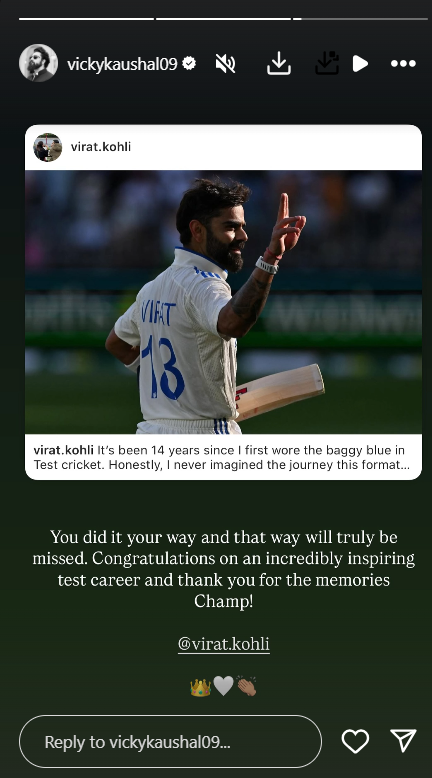 विक्की कौशल ने लिखा, "आपने हमेशा अपने तरीके से खेला और हम इसे हमेशा याद रखेंगे। ऐसे शानदार और प्रेरक टेस्ट करियर के लिए बधाई और इतनी सारी यादों के लिए धन्यवाद चैंप।"