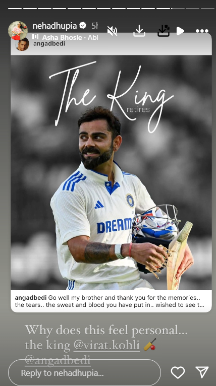 अंगद बेदी ने लिखा, "मैंने नेहा से वादा किया था कि मैं तुम्हें इंग्लैंड में फिर दिखाऊंगा..जर्सी नंबर 18, तुम्हें बहुत याद आएगी. विराट कोहली अच्छे हो राजा".