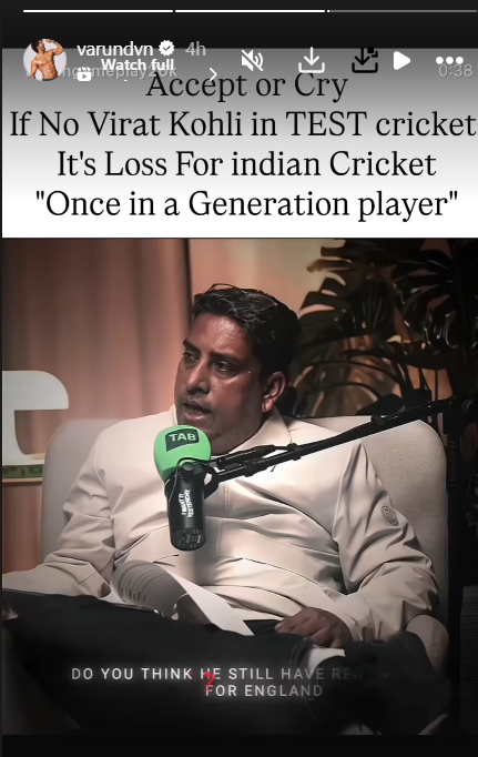 वरुण धवन ने एक वीडियो शेयर किया, जिसमें पॉडकास्ट में एक व्यक्ति विराट कोहली के टेस्ट क्रिकेट सफर के बारे में बात कर रहा है और साथ ही इसमें लिखा, स्वीकार करें या रोएं, अगर विराट कोहली टेस्ट क्रिकेट में नहीं हैं, तो यह भारतीय क्रिकेट टीम के लिए बहुत बड़ा नुकसान है। ऐसा खिलाड़ी दशक में एक बार आता है।