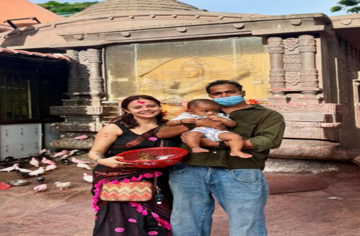 अभिनेत्री ने इंस्टाग्राम पर वहां की तस्वीरें शेयर की थी, जिसमें वह माथे पर पीले रंग का चंदन लगाए बेटे और पति संग पोज देते नजर आईं।