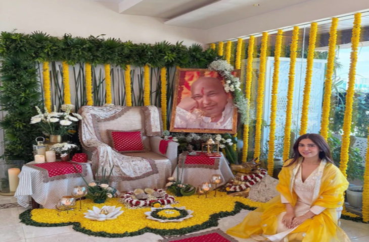 तस्वीरों में भूमि गुरुजी की तस्वीर के पास बैठी हुई नजर आ रही हैं, और फर्श पर फूलों से सुंदर सजावट की गई है।
