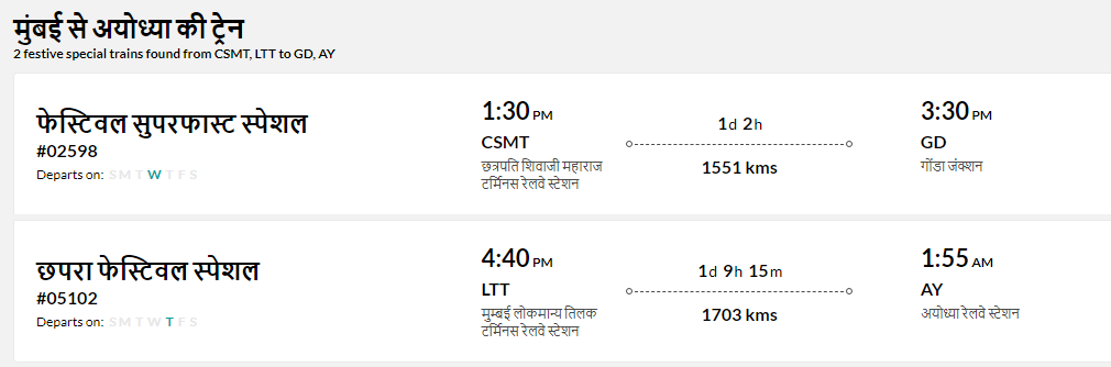 मुंबई और अयोध्या के बीच के मार्ग के लिए, किसी भी ट्रेन एप से देख सकते हैं।