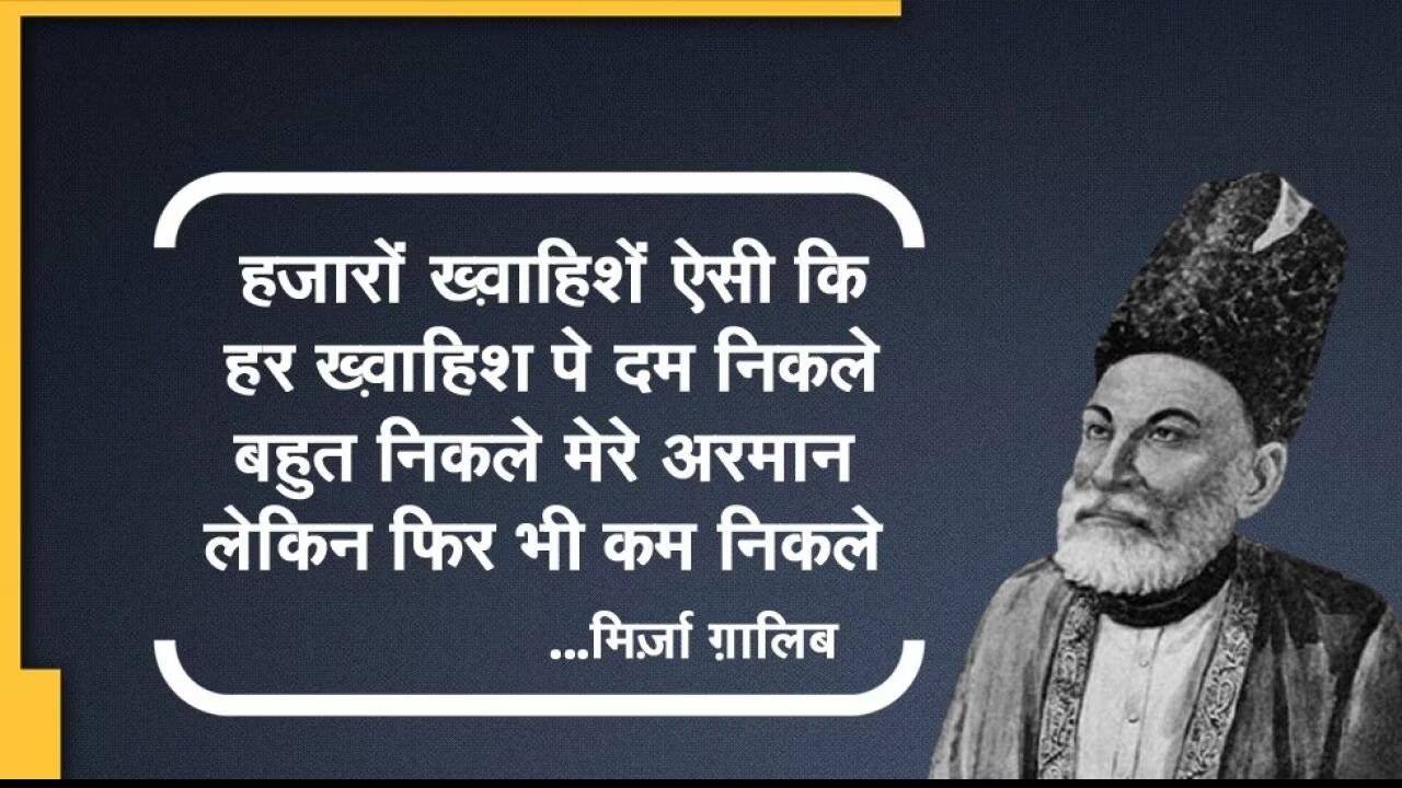 मिर्जा गालिब उर्दू के महान लोकप्रिय शायरों में से एक थे. उर्दू शायरी के लिए इनकी पहचान विश्व स्तर पर हैं. आज भी शेर – ओ – शायरी की जब बात होती हैं. तब जुबान पर पहला नाम मिर्जा गालिब का ही आता हैं. 27 दिसम्बर 1797 को आगरा के एक सैनिक पृष्ठभूमि तुर्क परिवार में उनका जन्म हुआ था. इनका पूरा नाम “मिर्जा असद – उल्लाह बेग खां” हैं. गालिब साहब के बच्चपन में ही उनके पिता का देहांत हो गया था. गालिब साहेब को बच्चपन से ही कविता और शायरी लिखने का शौक था. जब वह 11 वर्ष के थे तभी से ही कविता लिखना शुरू कर दिया था, तो आईये Mirza Ghalib की कुछ मशहूर शायरी पढ़ते हैं...