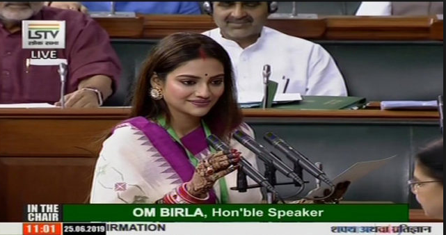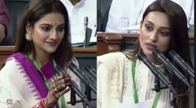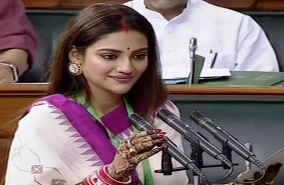अपनी इस ग्रांड शादी के बाद हाल ही में नूसरत भारत लौटी।और यहां आते ही उन्होनें संसद में शपथ ली।इस दौरान मंगलवार को नुसरत पहली बार सांसद पद की शपथ लेने पहुंची थी। इस दौरान जब शपथ लेने के लिए नुसरत गईं तो उनकी चर्चा हर तरफ होने लगी। नुसरत सुहाग की चूड़ियां, मांग में सिंदूर और माथे पर बिंदी के साथ नुसरत इंडियन वुमन के अवतार में संसद पहुंची। इस मौके की तस्वीरें और वीडियो सोशल मीडिया पर खूब वायरल हो रही है। नुसरत इस मौके पर बेहद खूबसूरत नजर आई।