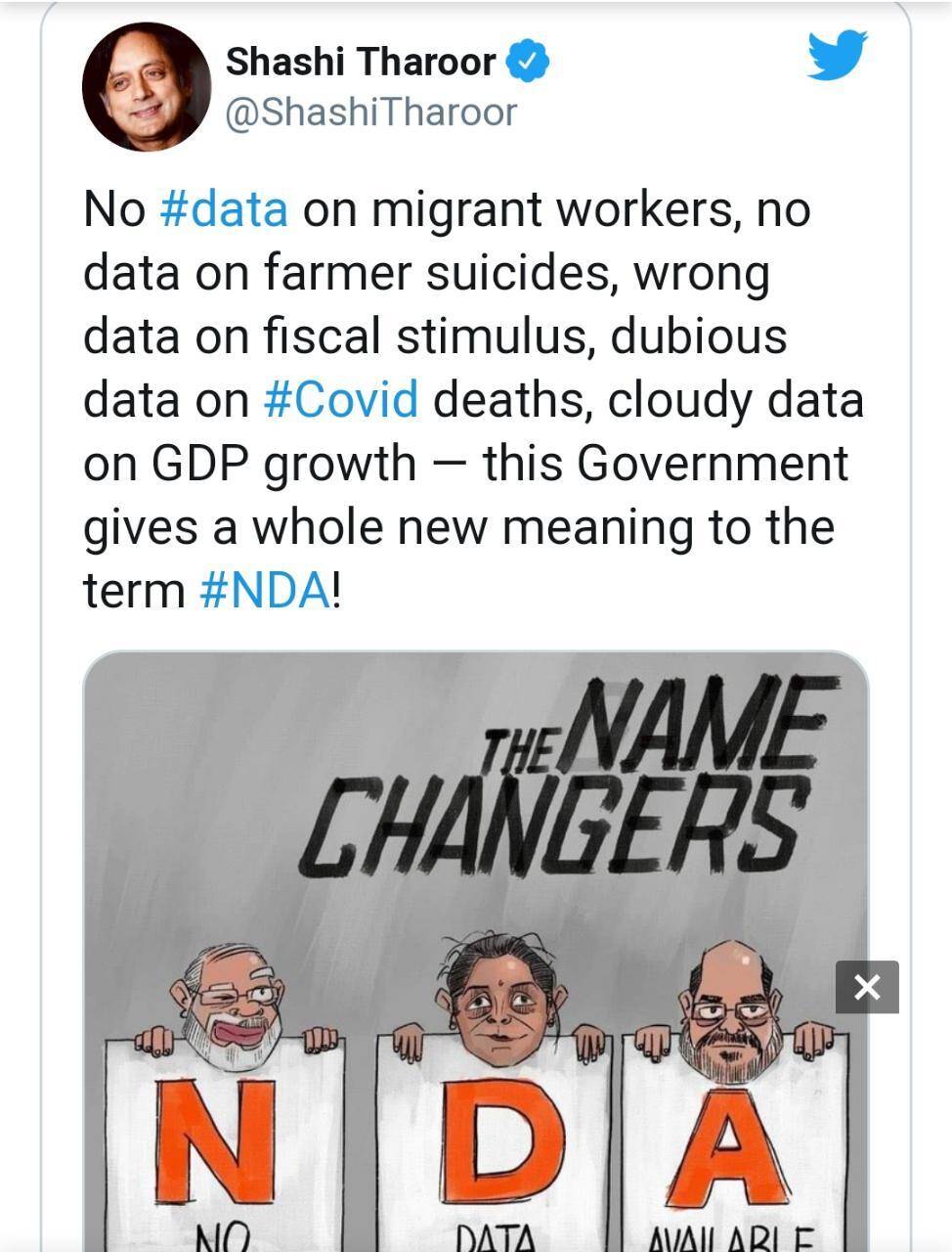 उन्होंने लिखा,”प्रवासी मजदूरों पर कोई डेटा नहीं है, किसानों की आत्महत्या पर भी कोई डेटा नही है.फिस्कल स्टीमुलस पर गलत डेटा है,कोविड से हुई मौतों पर भी भ्रामक डेटा ह,जीडीपी ग्रोथ को लेकर कोई साफ डेटा नहीं है- इस सरकार ने NDA टर्म की परिभाषा ही बदल दी है।”