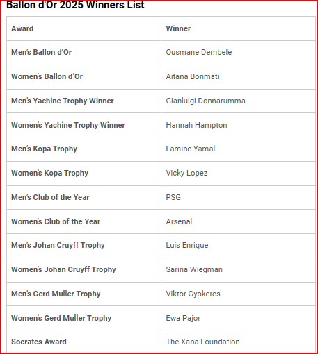 Ballon d'Or 2025 Winners List: उस्मान डेम्बेले और ऐताना बोनमाती ने फुटबॉल जगत में रचा इतिहास, देखें विजेताओं की पूरी लिस्ट