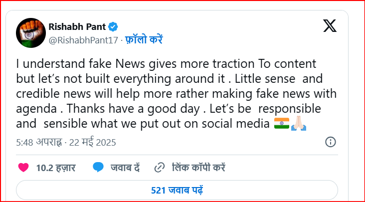 "हमें नुकसान पहुंचाना..." लखनऊ के प्लेऑफ की दौड़ से बाहर होने पर मिशेल मार्श ने कही बड़ी बात, ऋषभ पंत का किया समर्थन पंत ने इन खबरों पर कहा, 'मैं समझता हूं कि फर्जी खबरें खबरों को बहुत ज्यादा खींचने का दावा करती हैं, लेकिन सिर्फ इसी के इर्द-गिर्द बातें नहीं गढ़ी जानी चाहिए। थोड़ी सी समझ और विश्वास के साथ लिखी गई खबरें, किसी एजेंडे के साथ लिखी गई फर्जी खबरों से बेहतर काम करती हैं। धन्यवाद आपका दिन अच्छा है। हम सोशल मीडिया पर जो भी पोस्ट करते हैं, उसके प्रति अधिक जिम्मेदार और समझदार बनें।'