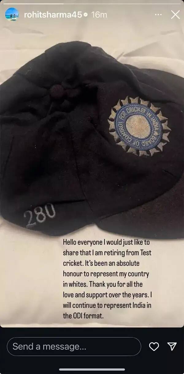 रोहित ने इंस्टा स्टोरी के जरिये संन्यास की घोषणा करते हुए लिखा, 'सभी को नमस्कार। मैं बस साझा करना चाहता हूं कि टेस्ट क्रिकेट से संन्यास ले रहा हूं। सफेद पोशाक में अपने देश का प्रतिनिधित्व करना मेरे लिए सम्मान की बात रही। सालों से आप सभी के प्यार और समर्थन के लिए शुक्रिया। मैं वनडे प्रारूप में भारत का प्रतिनिधित्व करना जारी रखूंगा।'