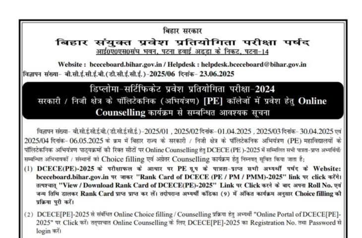 बिहार संयुक्त प्रवेश प्रतियोगिता परीक्षा बोर्ड (BCECEB) ने डिप्लोमा सर्टिफिकेट एंट्रेंस कॉम्पिटिटिव एग्जामिनेशन (DCECE) 2025 का परिणाम 23 जून 2025 को जारी कर दिया है। परीक्षा में शामिल हुए लाखों अभ्यर्थियों के लिए यह बड़ी खबर है, क्योंकि अब वे आधिकारिक वेबसाइट bceceboard.bihar.gov.in पर जाकर अपना रैंक कार्ड डाउनलोड कर सकते हैं।