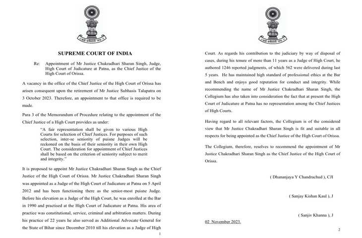 दिल्ली न्यूज डेस्क !!! भारत के मुख्य न्यायाधीश डी.वाई. चंद्रचूड़ की अध्यक्षता में सुप्रीम कोर्ट कॉलेजियम ने न्यायमूर्ति चक्रधारी शरण सिंह को उड़ीसा उच्च न्यायालय का मुख्य न्यायाधीश नियुक्त करने की सिफारिश की है। न्यायमूर्ति सिंह को अप्रैल 2012 में पटना उच्च न्यायालय के न्यायाधीश के रूप में नियुक्त किया गया था और वह वहां सबसे वरिष्ठ न्यायाधीश के रूप में कार्य कर रहे हैं। न्यायाधीश के रूप में पदोन्नत होने से पहले, वह 1990 में बार में नामांकित हुए थे और पटना उच्च न्यायालय में प्रैक्टिस किया था। उनका कार्यक्षेत्र संवैधानिक, सेवा, आपराधिक और मध्यस्थता मामले थे।