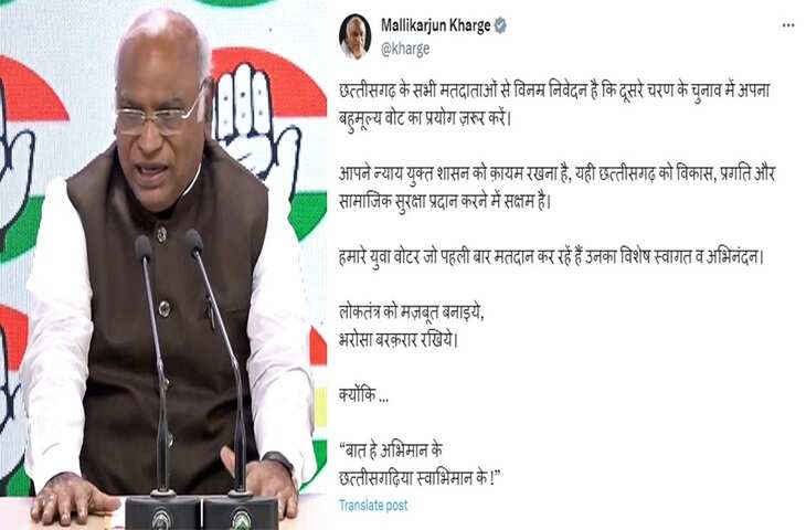 खड़गे ने एक्स पर एक पोस्ट में कहा, "छत्तीसगढ़ के सभी मतदाताओं से विनम्र अनुरोध है कि दूसरे चरण के चुनाव में अपना बहुमूल्य वोट डालें। आपको न्यायपूर्ण शासन बनाए रखना है, जो छत्तीसगढ़ को सुरक्षा, विकास, प्रगति और सामाजिक प्रदान करने में सक्षम है।"