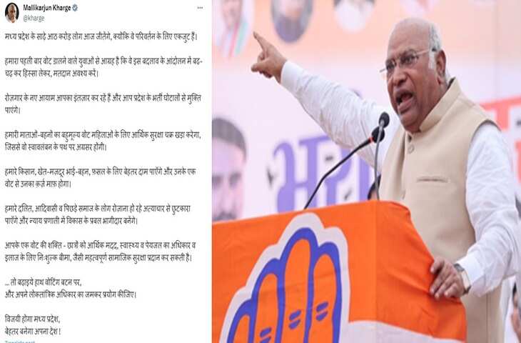एक्स पर हिंदी में एक पोस्ट में, खड़गे ने राज्य के लोगों से अपील करते हुए कहा: "मध्य प्रदेश के साढ़े आठ करोड़ लोग आज जीतेंगे, क्योंकि वे बदलाव के लिए एकजुट हैं। हम उन युवाओं से आग्रह करते हैं, जिनका परिवर्तन और मतदान के लिए इस आंदोलन में उत्साहपूर्वक भाग लेने का यह पहला अवसर।"