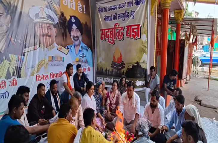 सेना को लेकर प्रदेश भाजपा नेताओं के विवादित बयानों को लेकर कांग्रेस पार्टी लगातार पूरे प्रदेश में विरोध प्रदर्शन कर रही है। रविवार को कांग्रेस विधायक आरिफ मसूद के नेतृत्व में हनुमान मंदिर पर सद्बुद्धि यज्ञ का आयोजन किया गया। तीनों सेना प्रमुखों के बैनर लगाकर यह यज्ञ किया गया। हालांकि इस दौरान कांग्रेस विधायक खुद दूर बैठे रहे और यज्ञ करते नजर नहीं आए। विधायक आरिफ मसूद ने बताया कि ब्लॉक कांग्रेस कमेटी के अध्यक्ष नवीन निक्की चौबे ने 10 नंबर मार्केट स्थित श्री हनुमानजी मंदिर पर भाजपा नेताओं के लिए सद्बुद्धि यज्ञ का आयोजन किया था, जो हिंदू परंपरा में वर्णित आध्यात्मिक प्रार्थना और ध्यान है। यह यज्ञ विशेष रूप से उन सत्ताधारी नेताओं को समर्पित है, जिन्होंने समय-समय पर भारतीय सेना या उसके उच्च अधिकारियों के बारे में अनुचित, अपमानजनक और असंवेदनशील टिप्पणियां की हैं और कर रहे हैं। भगवान नेताओं को सद्बुद्धि दे। मसूद ने कहा कि वह ईश्वर से प्रार्थना करते हैं कि ऐसे नेताओं को सद्बुद्धि दें तथा भारत के प्रधानमंत्री से अनुरोध करते हैं कि ऐसे नेताओं के खिलाफ कार्रवाई करें जो लगातार देश और सेना का अपमान कर रहे हैं। कार्यक्रम में मुख्य रूप से भोपाल मध्य विधानसभा क्षेत्र के विधायक आरिफ मसूद और ब्लॉक कांग्रेस के सदस्य मौजूद रहे।