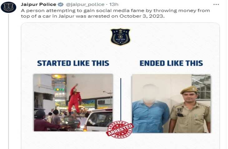 इस बीच, जयपुर पुलिस ने अपने एक्स अकाउंट पर नकाबपोश व्यक्ति की पैसे फेंकते हुए एक तस्वीर और उसे गिरफ्तार किए जाने की एक अन्य तस्वीर साझा करते हुए कहा, ''जयपुर में एक कार के ऊपर से पैसे फेंककर सोशल मीडिया पर प्रसिद्धि पाने का प्रयास करने वाले एक व्यक्ति को 3 अक्टूबर, 2023 को गिरफ्तार कर लिया गया।'' तस्वीर के कैप्शन में लिखा है, ''इस तरह शुरू हुआ, ऐसे खत्म हुआ।'' आगे कहा गया, "यह घटना, जो वायरल हो गई, आपराधिक प्रक्रिया संहिता की धारा 151 के तहत गिरफ्तारी हुई, जिसमें शामिल वाहन को एमवी एक्ट के तहत जब्त कर लिया गया।"