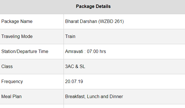 भारत दर्शन (WZBD 261) – यह ट्रेन अमरावती से यात्रा को शूरू करेगी फिर, धनगांव, वर्धा, नागपुर, पांढुर्ना, अमला, इटारसी रूकेगी। और फिर यह यात्रा इटारसी से आंवला से श्वेतपूर्णा से नागपुर से वर्धा से धनगाँव से अमरावती और फिर वितरण पर खतम होगी। यह ट्रेन आगरा, मथुरा, हरिद्वार, अमृतसर, वैष्णो देवी को कवर करेगी। इसके लिए एक जने को 7,560रूपय देने होंगे स्टैंडर्ट कैटेगरी के लिए और कंसोक्ट कैटेगरी के लिए 9,440रूपय।