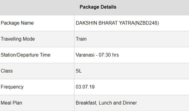 साउथ भारत ट्रेवल – यह पाकेज रामेश्वरम – मदुरै – कोवलम – त्रिवेंद्रम – कन्याकुमारी – तिरुचिरापल्ली – तिरुपति – मल्लिकार्जुन को कमर करेगा। यह यात्रा वाराणसी से शूरू होकर प्रतापगढ़ – अमेठी – रायबरेली – लखनऊ – कानपुर – इटावा – भिंड – ग्वालियर – झाँसी पर खतम होगी। इसके लिए एक जने को 12,285 रूपय देने होंगे।