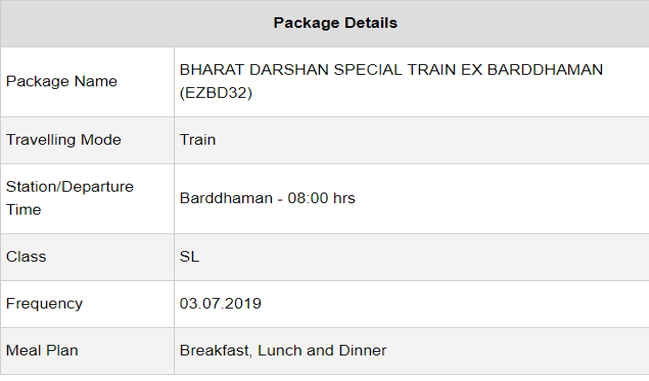 भारत दर्शन स्पेशल ट्रेन – यह ट्रेन हरिद्वार – ऋषिकेश – माता वैष्णो देवी को कवर करेगी। यह यात्रा बर्धमान से शूरू होकर बोलपुर शांतिनिकेतन – रामपुर हट – दुमका – भागलपुर – किउल जाएगी। इसके लिए एक जने को 6,300 रीपय देने होंगे।