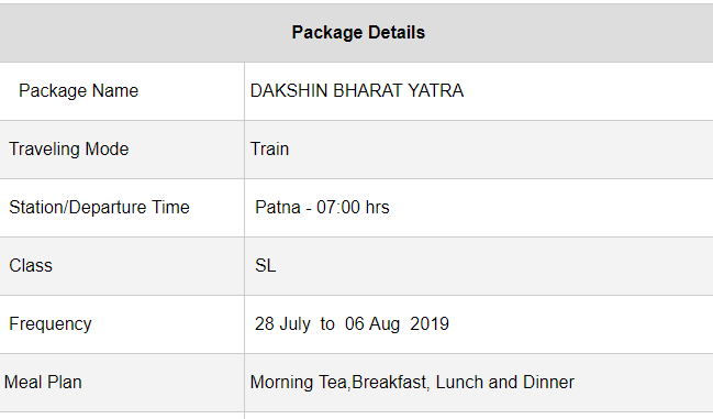 दक्षिण भारत यात्रा (WZBD260) – यह ट्रेन रामेश्वरम – मदुरै – कन्याकुमारी – त्रिवेंद्रम – मल्लिकार्जुन को कवर करेगी। यह यात्रा रेवा से शूरू होकर सतना – मैहर – कटनी – जबलपुर – नरसिंहपुर – पिपरिया – इटारसी – बैतूल – अमला – व्हाइटहर्ना – नागपुर डीबोर्डिंग पॉइंट – नागपुर – पांडुरना – अमला – बैतूल – इटारसी – पिपरिया – नरसिंहपुर – जबलपुर – फसल – मेहर – सतना – रीवा जाकर खतम हेगी। इसके लिए एक जने क 9,450 रूपय देन होंगे।