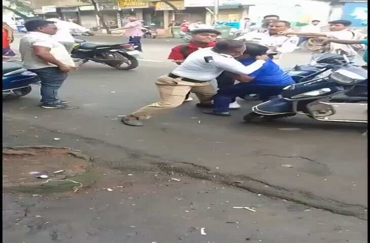 सोशल मीडिया पर एक वीडियो वायरल हो रहा है। जिसमें देखा जा सकता है कि दो लोग मिलकर एक ट्रैफिक पुलिसकर्मी की पिटाई कर रहे हैं। वीडियो में आप देख सकते हैं कि ट्रैफिक पुलिसकर्मी की पिटाई की जा रही है। यह वायरल वीडियो मुंबई के नालासोपारा का बताया जा रहा है। बताया जा रहा है कि यहां तुलिंज इलाके में पिता-पुत्र ने दो ट्रैफिक पुलिसकर्मियों पर हमला कर दिया। यह पूरी घटना एक राहगीर के कैमरे में कैद हो गई। जो अब सोशल मीडिया पर वायरल हो रहा है।